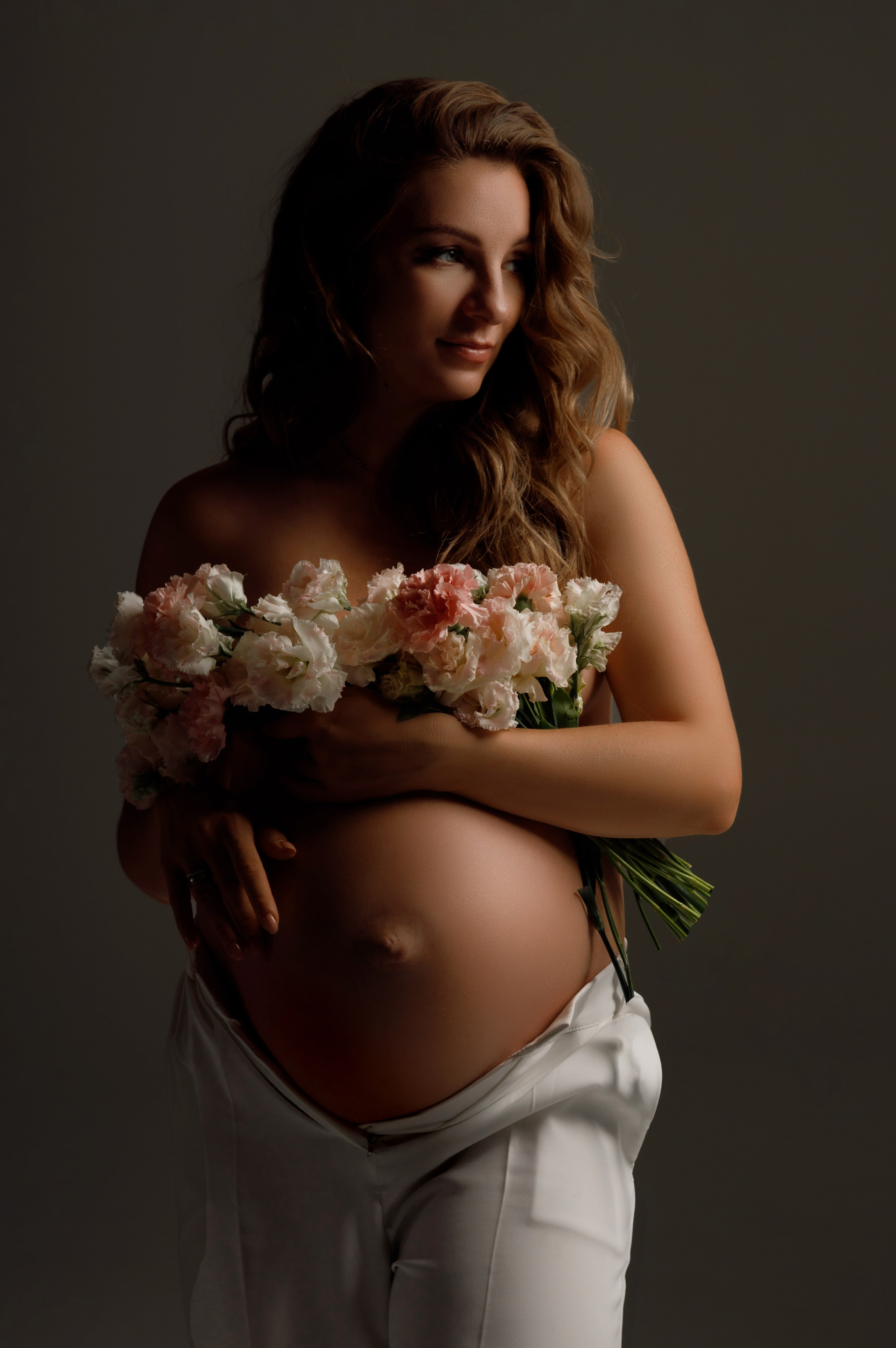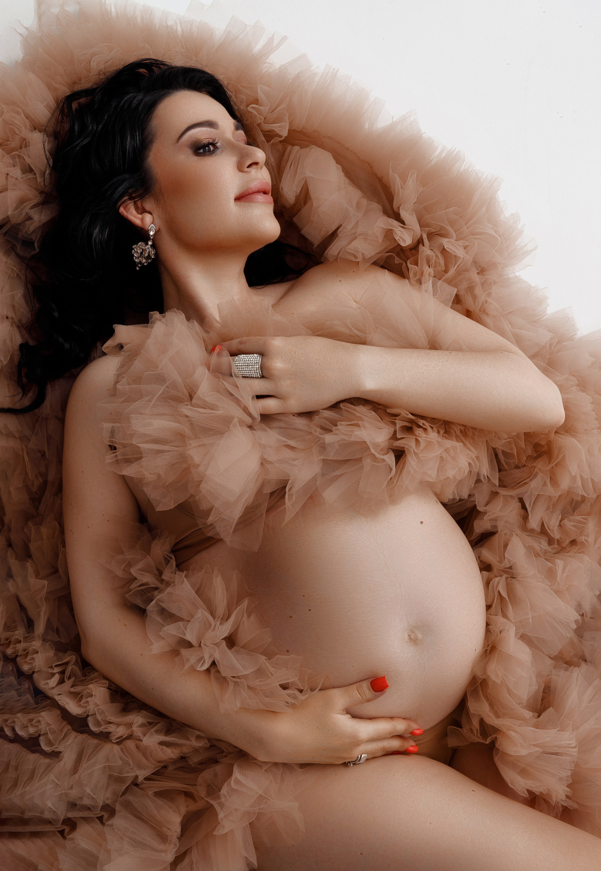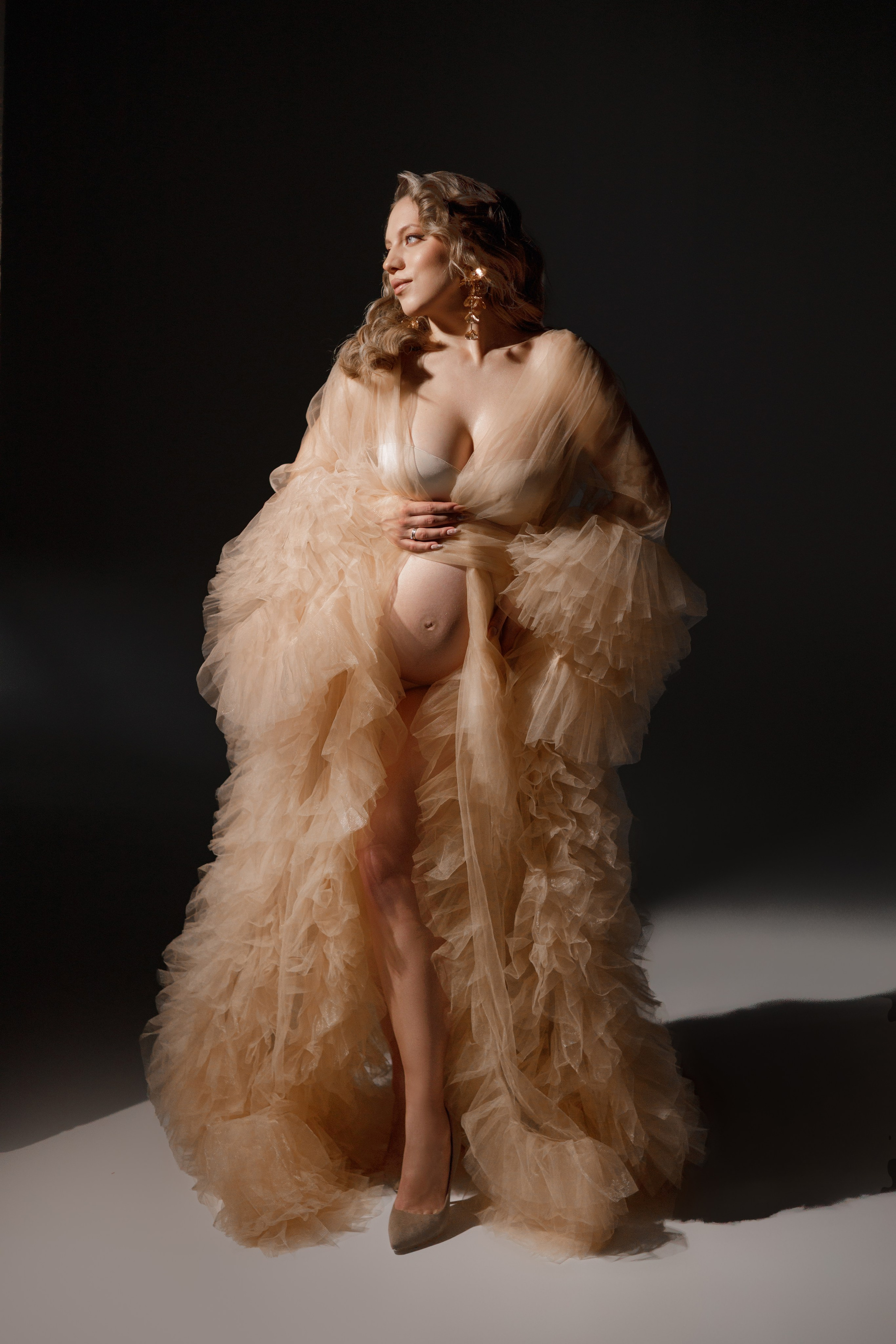 Важно, чтобы животик уже был заметен, но не слишком сильно, так как на последних сроках беременности будущей маме будет трудно физически выдержать полтора часа, потраченные на макияж и укладку, а также саму съёмку.